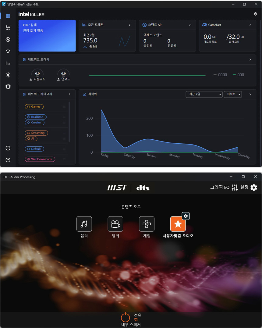DTS 오디오 앱에서 다양한 프로파일을 제공해 사용자에 맞는 사운드를 즐길 수 있으며 킬러 무선랜 전용 S/W를 제공해 네트워크 모니터링은 물론 다양한 설정이 가능하다.