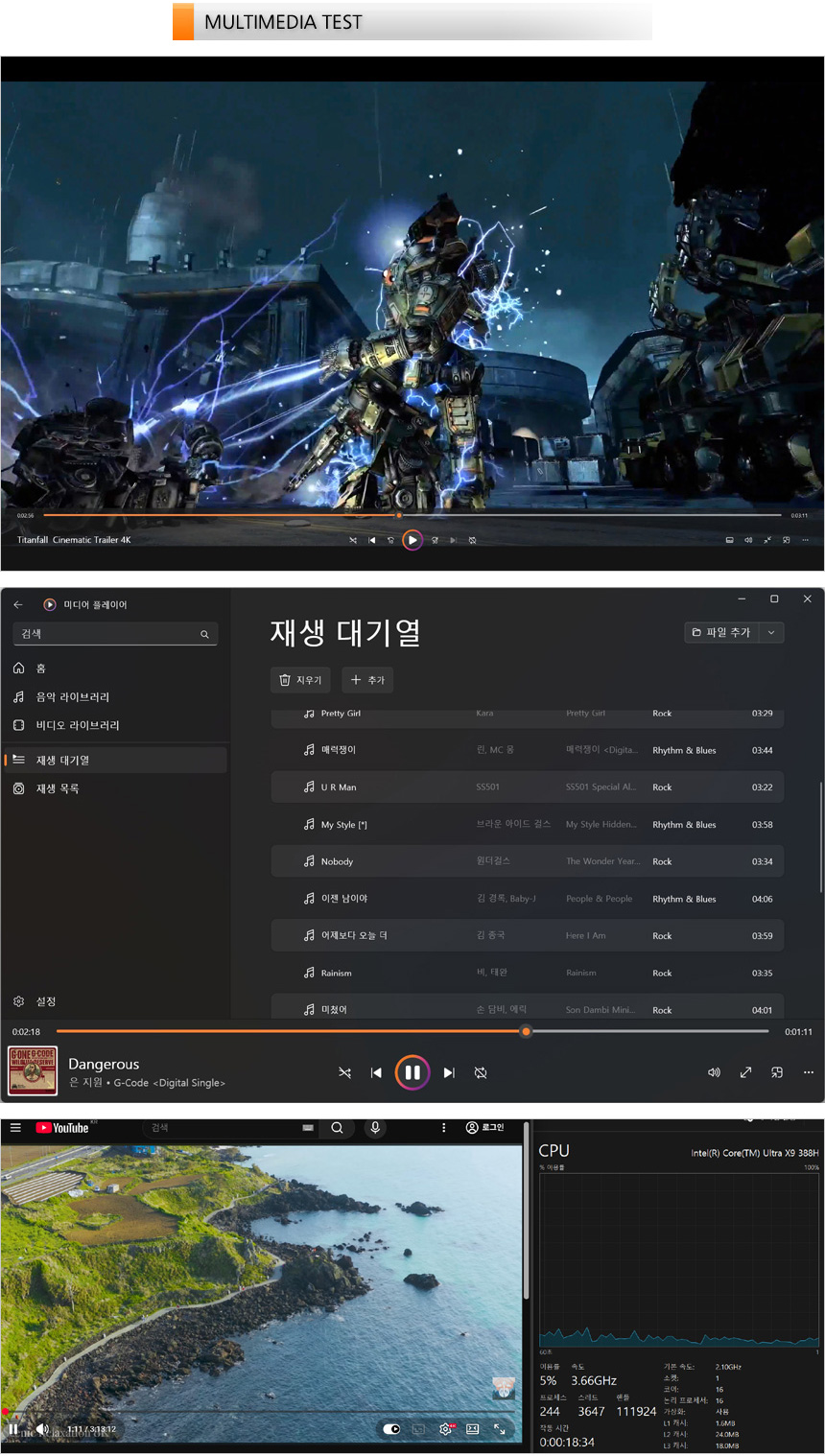 4K 동영상을 이용해 멀티미디어 테스트를 진행하고 있는 모습으로 16형 대화면에 QHD+ 해상도의 OLED 패널을 탑재해 선명한 영상을 즐길 수 있었으며 (진한 블랙 표현이 특히 마음에 들었다.) 사운드 퀄리티도 뛰어나 높은 몰입감을 경험할 수 있었다. 또한 MP3 파일을 이용해 스피커 사운드 테스트를 진행했는데 4개의 유닛을 지원하는 모델답게 게이밍 노트북 못지 않은 높은 출력은 물론 밀도감 높은 단단한 사운드를 들려주어 귀가 아주 즐거웠다.