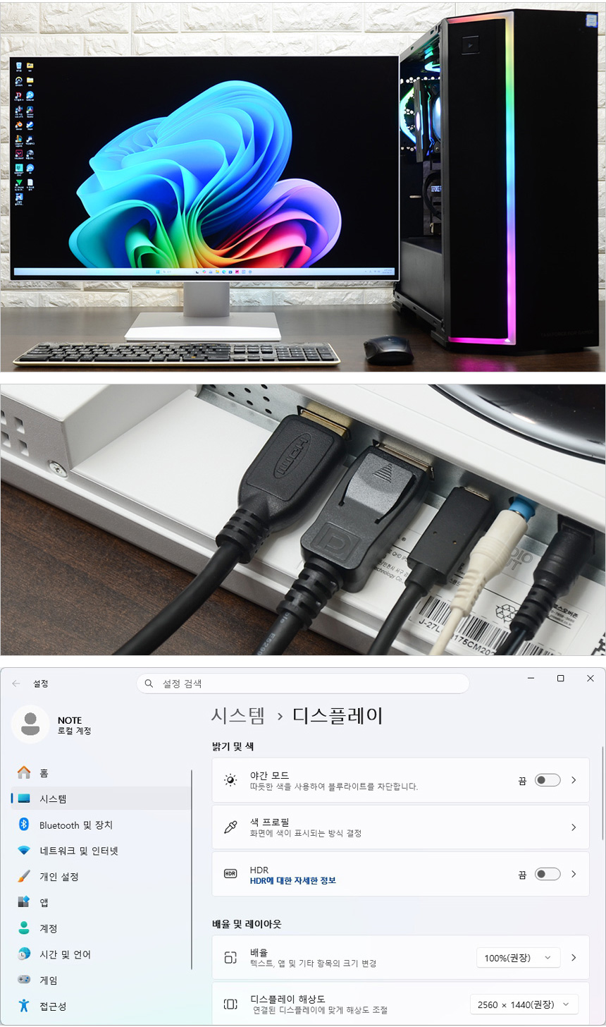 테스트를 위해 책상에 PC와 모니터를 설치한 모습으로 4면 슬림베젤을 적용한 27형 모니터 답게 공간을 많이 차지하지 않았다. 집이나 사무실 등의 책상이 협소하더라도 사용에 큰 어려움은 없을 것이다. 또한 HDR 기술을 지원하는 모니터 답게 윈도우 에서도 HDR 설정이 가능한 것을 확인할 수 있다.