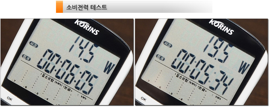 소비전력 테스트를 진행하고 있는 모습으로 50% 밝기에서 14.5W, 100% 밝기에서 19.5W 소비전력으로 작동했다. (일반적인 용도로 사용시 50% 밝기로도 충분했다. 전기세 걱정없이 사용할 수 있을 것이다.)