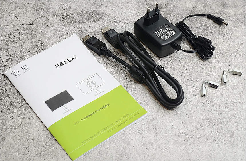액세서리의 모습으로 케이블 일체형 전원 어댑터와 DP 케이블을 비롯해 설명서, 베사홀 연장볼트가 포함된 것을 확인할 수 있다.