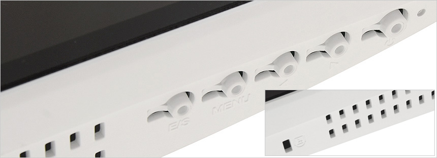 모니터 하단부의 모습으로 OSD 버튼이 장착되어 모니터의 주요 기능을 손쉽게 조작할 수 있다. 또한 도난 방지를 위한 시큐리티 홀과 통풍구가 설치되어 있고 두 개의 3W 스피커가 장착되어 시원한 사운드를 즐길 수 있다.