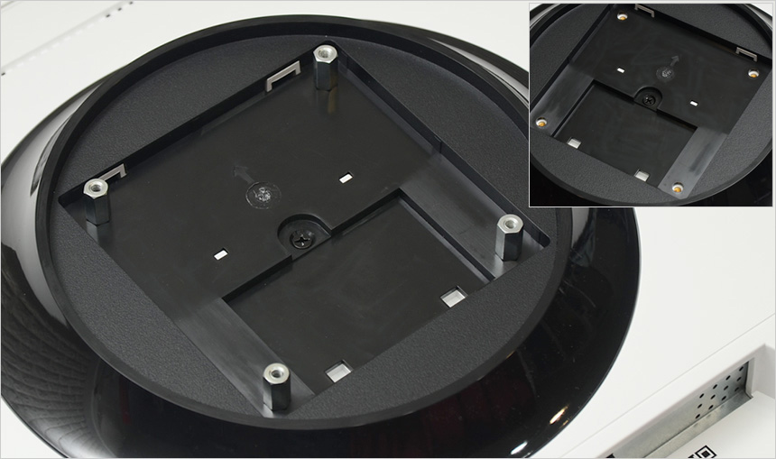 멀티스탠드의 모습으로 케이블 정리를 위해 후면에 홀이 설치되어 있고 바닥면에는 고무패드가 설치되어 미끄러짐을 방지한다.