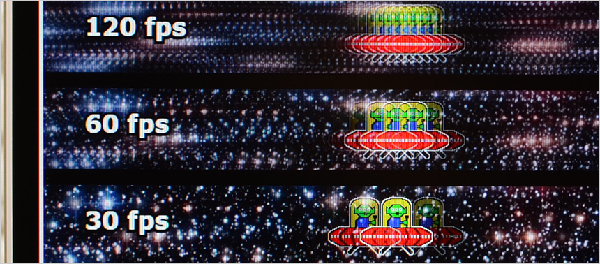 60Hz 주사율을 지원하는 일반 모니터와 달리 120Hz 주사율을 지원해 부드러운 영상을 즐길 수 있다. 상단의 사진은 120Hz 의 높은 주사율을 쉽게 확인할 수 있도록 하위 프레임과 같이 재생되는 영상 (960 Pixel Per Sec) 을 셔터스피드 1/20 로 촬영한 모습으로 프레임이 낮을수록 캐릭터의 수가 적으며 프레임이 높아질수록 시간당 많은 화면이 뿌려지기 때문에 캐릭터의 수가 많은 것을 확인할 수 있다.