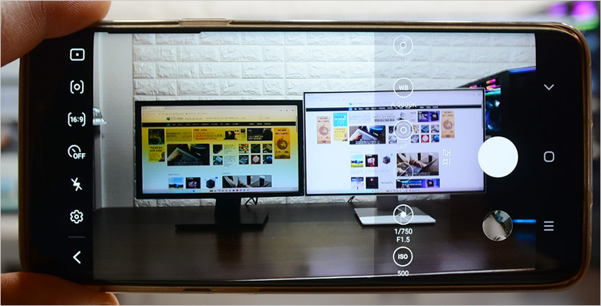 깜빡임으로 인한 눈의 피로를 최소화 하기 위해 플리커 프리 기술을 지원한다. 상단의 사진은 테스트를 위해 일반 모니터를 추가로 셋팅한 모습으로 큰 차이가 없는 것을 확인할 수 있다. 스마트폰의 카메라 기능을 이용하면 모니터의 플리커 현상을 확인할 수 있다. (프로 모드에서 셔터스피드 1/300 이상으로 셋팅) 테스트용 모니터는 플리커 현상이 발생하는데 반해 크로스오버 27LGQ175CM 은 깜빡임 없이 부드러운 영상을 재생해 주었다. (동영상에서 자세히 확인할 수 있다.)