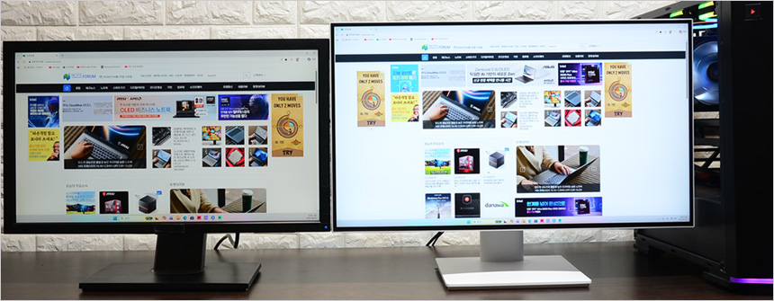 두 대의 모니터를 셋팅한 김에 베젤 두께를 비교해 보았는데 슬림베젤이 적용된 모니터 답게 두께 차이가 상당했다. (베젤이 얇으면 듀얼모니터 설정시 이질감을 최소화 할 수 있으며 높은 몰입감을 선사한다.)