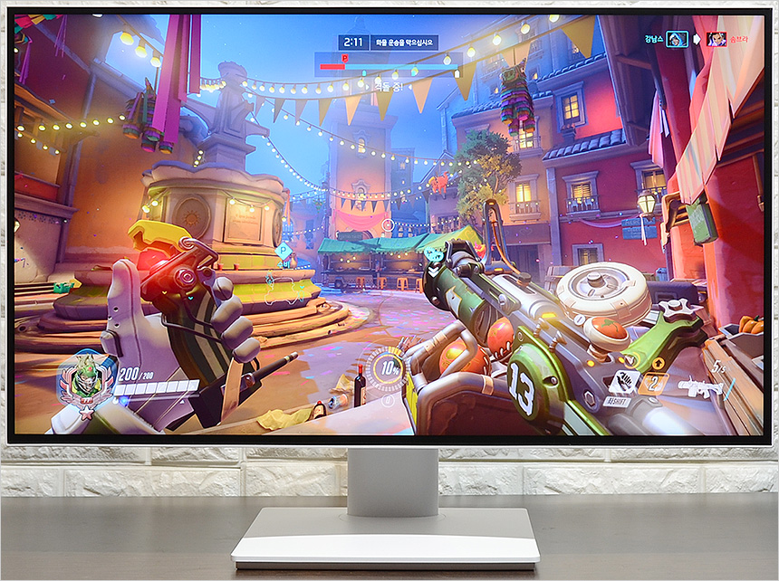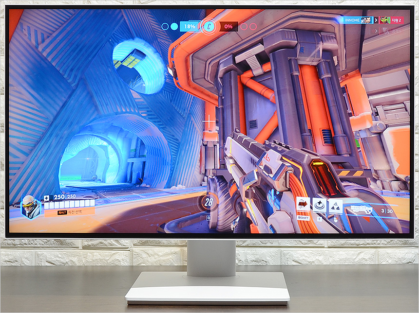 10억 7천만 컬러의 나노 IPS 블랙 패널 탑재 모니터 답게 진하고 선명한 컬러 표현이 인상적이었으며 4면 슬림 베젤을 적용해 눈에 꽉 들어찬 몰입감 높은 영상을 즐길 수 있었다. (게이밍 전용 모니터와 비교하면 스펙이 약간 떨어지지만 캐주얼하게 게임을 즐기는 필자는 전혀 부족함이 느껴지지 않았다.)