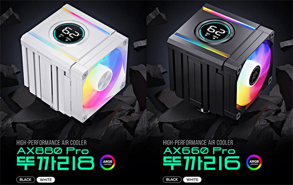 싸이번은 원형 디지털 디스플레이를 탑재한 SNOWMAN 공랭 CPU 쿨러 신제품 ‘AX880 PRO 뚜까리8’과 ‘AX660 PRO 뚜까리6’을 출시했다. 블랙 또는 화이트 색상으로 출시된 신제품은 CPU 온도와 전력 사용량, 사용률 등 시스템 상태를 직관적으로 확인할 수 있는 상단 디지털 디스플레이와 듀얼타워 방열 설계, 상단 커버·팬 일체형 구조를 적용해 냉각 성능과 조립 편의성을 함께 강화한 것이 특징이다.