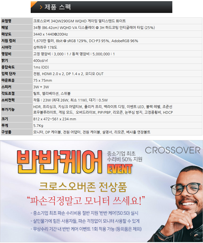 크로스오버 모니터는 5억원 생산물 배상 책임보험에 가입되어 있으며 중소기업 최초로 수리비 50%를 지원하는 반반케어 이벤트를 진행하고 있어 안심하고 사용할 수 있다. (무상수리 기간내 파손이 발생했을 때 수리비용의 절반을 지원한다.)