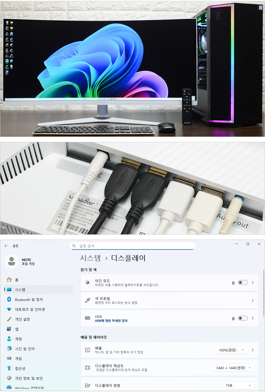 테스트를 위해 PC와 모니터를 셋팅한 모습으로 대화면 울트라와이드 모니터 답게 많은 공간을 차지했다. 이 제품은 일반 모니터 대비 좌우폭이 무척 넓기 때문에 모니터 설치전 반드시 여유 공간을 확보해야 한다. (듀얼 모니터를 사용한다고 생각하면 된다.) 2개의 DP 와 HDM 단자를 지원해 PC뿐만 아니라 게임콘솔이나 OTT 플레이어등 다양한 디바이스 연결이 가능하며 HDR 기술이 적용된 모델답게 디스플레이 메뉴에서 HDR 설정이 가능한 것을 확인할 수 있다.