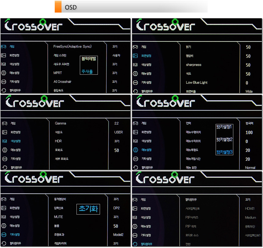 OSD 메뉴의 모습으로 밝기와 명암비, 블랙레벨, 색온도 설정이 가능한 것을 확인할 수 있으며 HDR, 프리싱크, 블루라이트 설정도 지원한다. 또한 울트라와이드 모니터 답게 멀티윈도우 (PIP/PBP) 도 지원하는 것을 확인할 수 있다. (리모콘을 제공해 편하게 메뉴를 조정할 수 있다.)