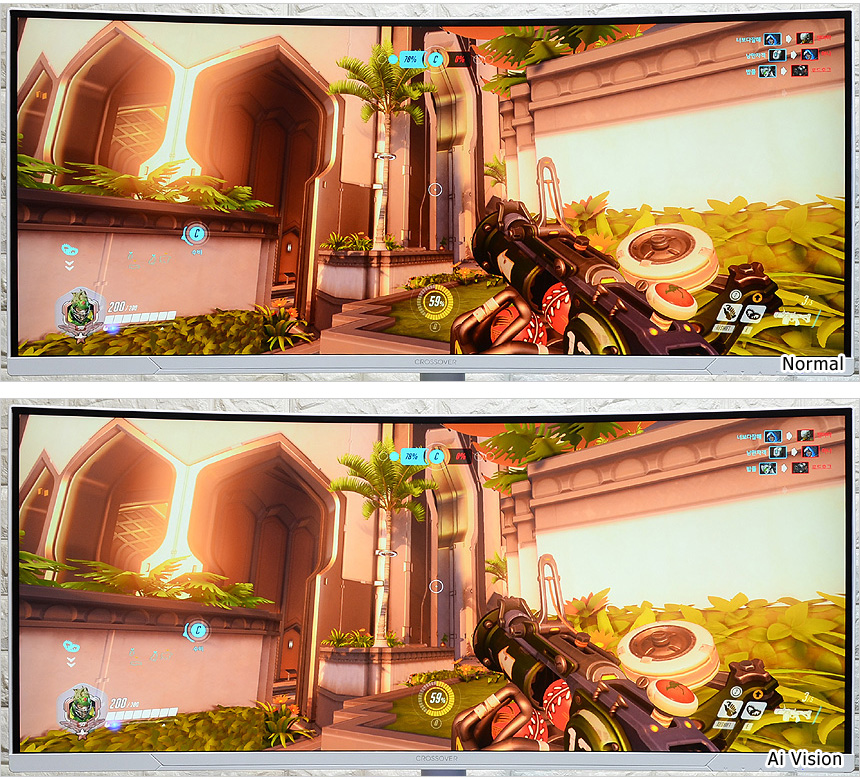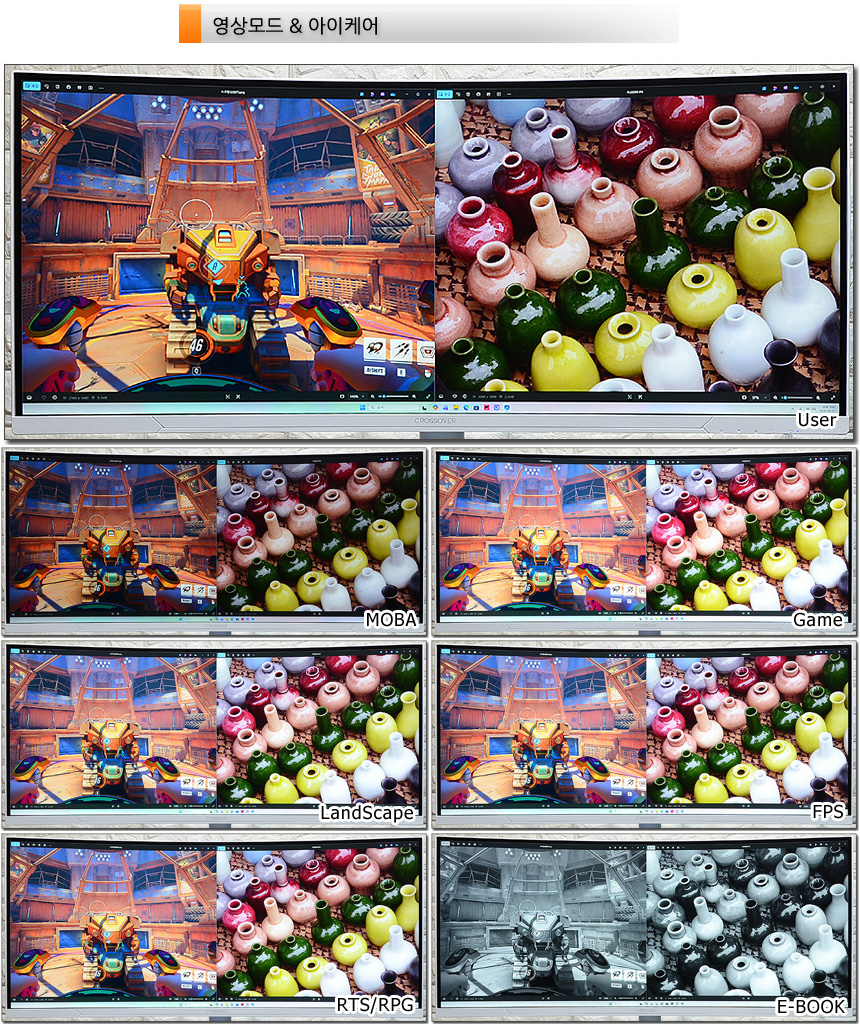다양한 화면 모드를 제공해 컨텐츠에 맞는 최적의 영상을 즐길 수 있다. 상단의 사진은 지원모드의 비교 모습으로 분명한 차이를 경험할 수 있었다. (게임이나 컨텐츠에 따라 일일이 밝기를 조절할 필요가 없다.)