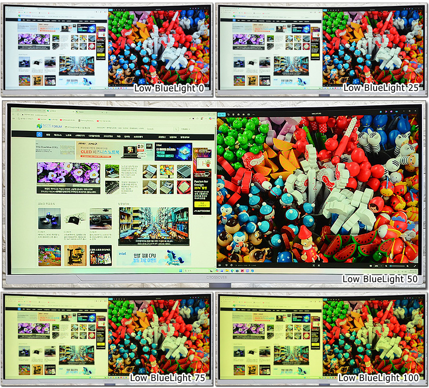 눈건강을 위해 다양한 기술을 적용했다. 상단의 사진은 눈건강을 해치는 블루라이트 감소 기능을 테스트 하고 있는 모습으로 설정값에 따라 차이가 발생하는 것을 확인할 수 있다. (색이 왜곡되기 때문에 게임이나 동영상 보다는 흰색 배경이 많은 웹서핑이나 오피스 등에서 활용하기 바란다.)