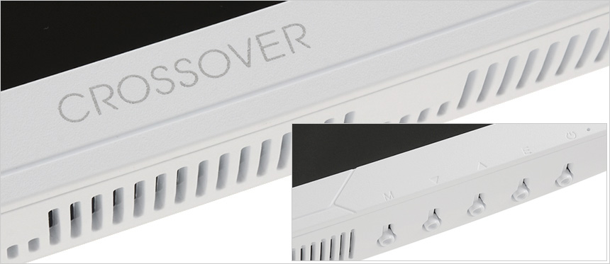 모니터 하단의 모습으로 중앙에 크로스오버 문구가 세겨진 것을 확인할 수 있으며 2개의 3W 스피커와 통풍구가 제공되는 것을 확인할 수 있다. 또한 측면에는 모니터 설정을 위한 OSD 버튼과 상태표시 LED를 지원한다. (리모콘이 기본 제공되어 편하게 모니터 기능을 설정할 수 있다.)