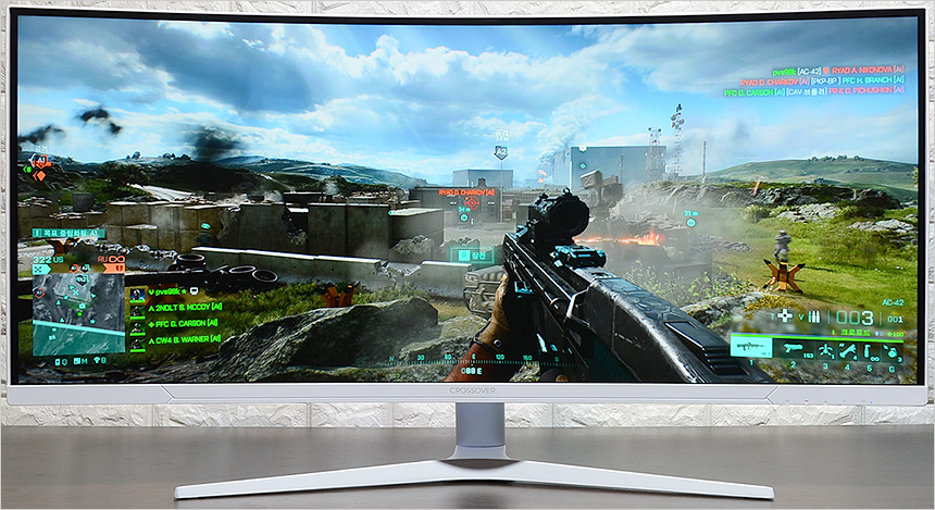 전면부의 모습으로 34형의 크기에 울트라 WQHD (3440 x 1440) 해상도를 지원하는 대기업 VA 패널이 장착되어 있다. IPS 수준은 아니지만 광시야각을 지원해 어떤 각도에서도 선명한 영상을 즐길 수 있으며 400cd/㎡ 의 높은 밝기로 야간이나 실내 맵 등에서 명확한 구분감을 제공한다.