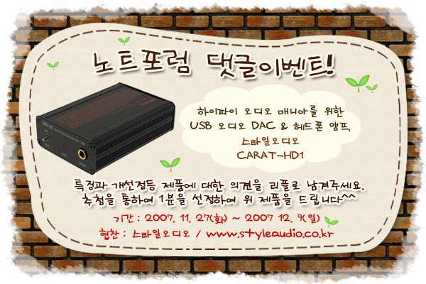 제품 기획에서 개발 및 생산에 이르는 전과정이 대한민국 영토내에서 이루어진 제품들로만 구성된 USB 오디오 DAC & 헤드폰 앰프 CARART-HD1은 고가의 오디오 기기등에서 볼 수 있는 TCXO(1.5PPM)와 TCXO전용 전원단이 장착되어 있으며 일본 오스콘, 미국의 버브라운, 독일의 위마등 '하이파이 오디오 전용 부품'의 사용과 위마의 필름 콘덴서 최상위 라인 제품 중 하나인 'MKP콘덴서', '실버마이카 콘덴서' 등 하이엔드 오디오급 부품이 사용된 하이파이 오디오 매니아를 염두해 두고 제작된 제품입니다. 이에 Hi-Fi & PC-Fi 전문 회사인 스타일오디오(www.styleaudio.co.kr)의 협찬으로 아래와 같이 리플 이벤트를 진행하오니 많은 참여 부탁드립니다.