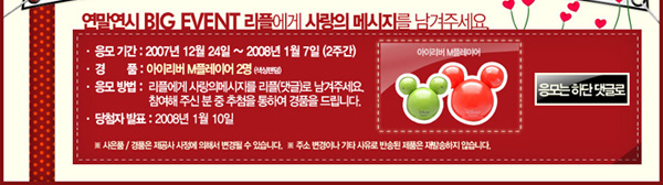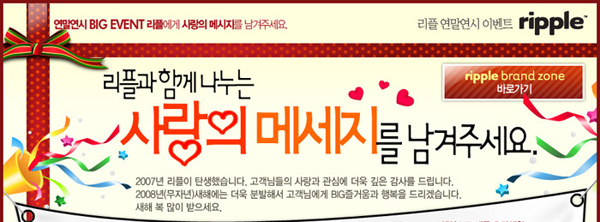 2007년 12월 24일 ~ 2008년 1월 7일까지 진행되었던 "리플과 함께 나누는 사랑의 메시지♡를 남겨주세요" 이벤트 결과를 아래와 같이 발표합니다. 참여해 주신 모든 회원 님들께 진심으로 감사드립니다.