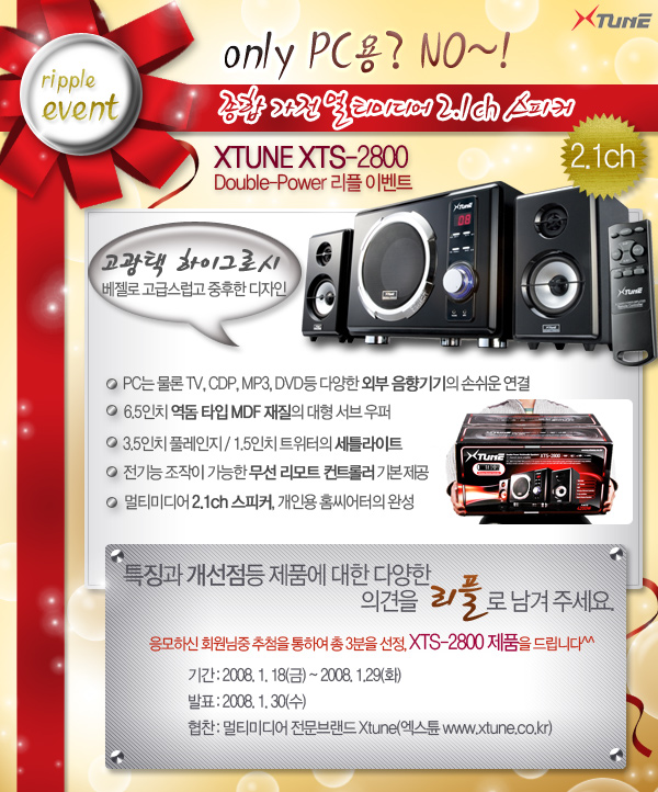 마우스의 휠버튼을 최초로 제작한 글로벌 브랜드, 지니어스(Genius)를 비롯하여 W3등의 국내 공식 디스트리뷰터 이강물산(대표이사 배정환, www.compukorea.co.kr)에서 멀티미디어 전문 브랜드 Xtune(엑스튠, www.xtune.co.kr)을 론칭하고 종합 가전 멀티미디어 2.1ch 스피커인 신규모델 XTUNE XTS-2800 Double-Power를 출시하였습니다. XTUNE XTS-2800 Double-Power는 6.5인치의 대형 서브 우퍼가 제공되는 2.1ch 스피커로 고광택 하이그로시 디자인과 함께 레드 LED의 디지털 음량 표시부와 블루 LED의 볼륨조절부등 고급스러운 디자인을 가지고 있는 제품입니다. 더불어 PC용에 한정된 제품이 아닌 TV, CDP, MP3P, DVD등 다양한 기기와의 손쉬운 연결을 지원하는 멀티미디어 스피커임과 동시에 전기능 조작이 가능한 무선 리모트 컨트롤러를 기본으로 제공해 사용의 편리성을 강조한 고급형 제품입니다.