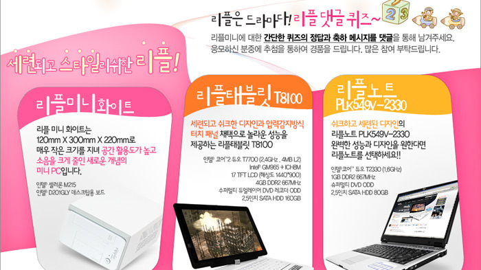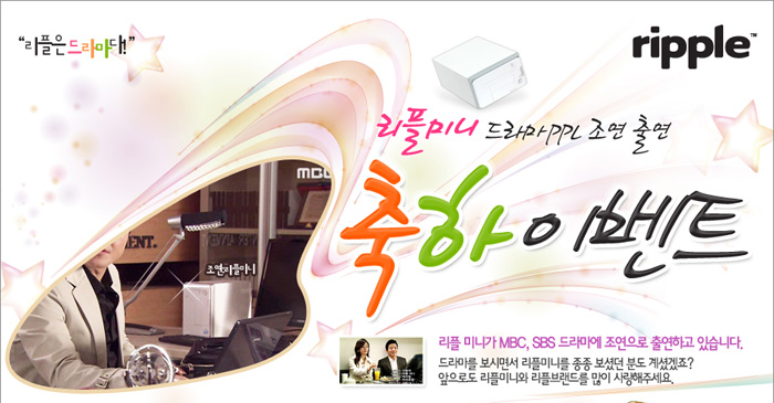 인텔 mini-ITX 규격의 리틀밸리 메인보드를 탑재한 심플 & 스타일리시 베어본 '리플미니'가 리플노트에 이어 MBC와 SBS 드라마에 조연으로 출연하고 있습니다. 이에 '리플(www.myripple.co.kr)'의 협찬으로 아래와 같이 이벤트를 진행하오니 많은 참여 부탁드립니다.