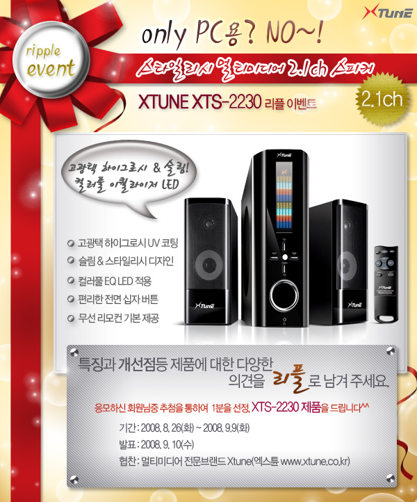9월 9일 화요일까지 진행되었던 '스타일리시 멀티미디어 2.1ch 스피커 XTUNE-2230' 이벤트 결과를 아래와 같이 발표합니다. 참여해 주신 모든 회원 님들께 진심으로 감사드립니다.