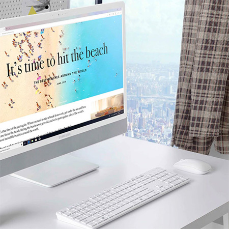 기본 제공되는 무선 키보드와 무선 마우스를 이용하여 정돈된 환경에서 삼성 올인원을 즐길 수 있다. 60.5cm FHD 대화면 디스플레이, 인텔 8세대 i3-8145U, 8GB DDR4, NVMe 256GB SDD 사양이며 가격은 89만 원 대이다.