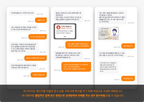 하지만 중고나라가 ‘위험 거래’로 분류한 사례를 살펴보면 거래 과정 중 구매자가 판매자 신뢰도에 의심을 갖기 시작하면 판매자는 주민등록증, 명함 등 각종 개인 정보를 공개하며 믿음을 얻기 위해 노력하는 경우가 있다. 하지만 이는 유출된 정보이거나 조작, 허위 인증일 가능성이 높다. 심지어 최근에는 판매자가 처음부터 구매자의 신뢰를 얻기 위해 메신저의 프로필을 가족 또는 아이 사진으로 설정하며 환심을 사는 경우가 있어 프로필에 현혹되지 않도록 조심해야 한다. 의심이 된다면 상대방과 전화나 문자로 연락을 진행하 고 기록을 남겨야 거래 관련 문제 발생 이후에도 구체적으로 상대를 특정할 수 있다. 특히 구매자와 판매자 간 문의와 흥정은 메신저를 활용하더라도 최종 결제는 반드시 중고나라 앱 내부의 ‘안심결제’를 통해 진행하는 것이 보다 안전한 방법이다. 그럼에도 불구하고 판매자가 의심된다면 기존 거래 이력이나 사이버캅, 더치트를 통해 계좌, 판매 이력을 살펴보는 것이 좋다.