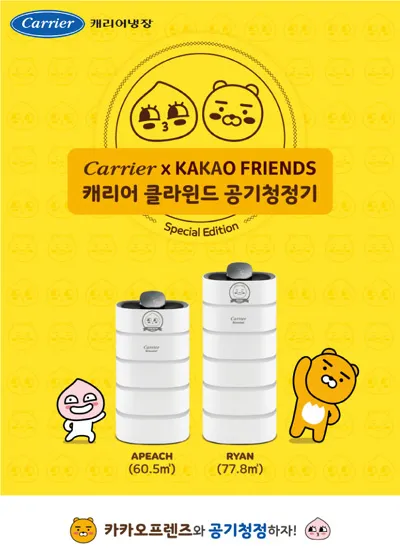 카카오프렌즈와 콜라보레이션한 ‘캐리어 클라윈드 공기청정기 카카오 콜라보’ 시리즈는 360도 원형필터로 구성되어 보다 넓은 공기 접촉면을 자랑한다. 또한 파워흡입 기능이 적용되어 바닥부터 천장까지 집안 전체를 청정지역으로 만들어준다.