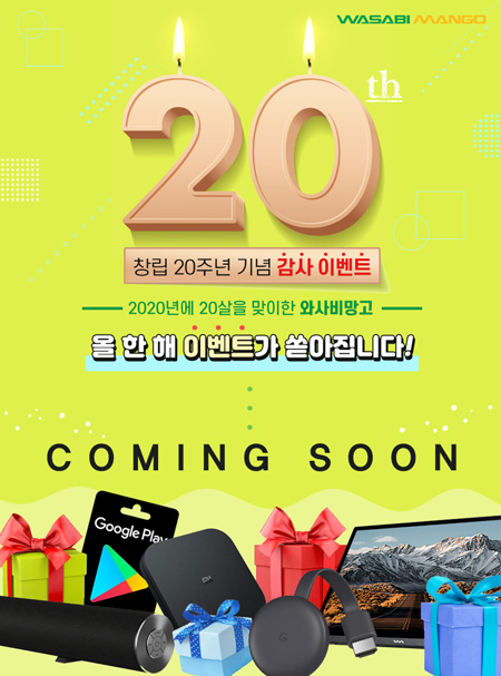 와사비망고 관계자는 "2020년 창립 20주년을 앞두고 고객님들께서 보내주신 성원에 보답하고자 다양한 행사를 기획했다."며 "이번 행사를 시작으로 2020년 한 해 동안 풍성한 행사를 계속해서 선보일 예정"이라고 말했다.