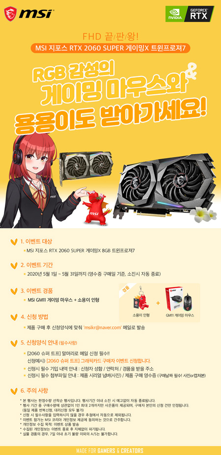 이번 행사는 2020년 5월 1일부터 5월 31일까지 ‘MSI 지포스 RTX 2060 SUPER 게이밍X 8GB 트윈프로져7’를 구매하는 고객에게 RGB 감성의 ‘GM11 게이밍 마우스’와 함께 ‘용용이 열쇠고리’ 증정한다. 준비된 경품이 모두 소진 시 행사는 자동으로 종료된다.