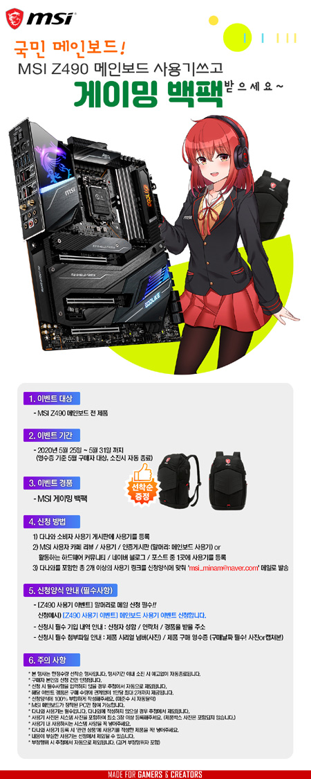 본 이벤트는 5월 25일(월)부터 5월 31일(일)까지 진행하며(단, 영수증 기준 5월 구매 고객 대상, 소진시 자동 종료), MSI Z490 칩셋을 장착한 메인보드 전 제품을 구매한 고객을 대상으로 한다. 이벤트 경품은 ‘MSI 게이밍 백팩’으로 우수한 사용기를 작성한 고객을 대상으로 선착순 증정 예정이다.