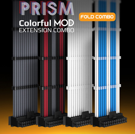 맥스엘리트 PRISM Colorful MOD EXTENSION COMBO FOLD는 기존 출시된 모델에서 24핀 메인 케이블의 커넥터를 ㄱ자로 꺾어 메인보드와 연결이 더욱 자연스럽게 연결되어 깔끔한 선정리를 할 수 있게 한다. 일반 18AWG 케이블보다 더욱 많은 41가닥의 동선으로 만들어져 최상의 품질과 안정성은 물론 유연성이 높아 장착과 선정리에 편리함을 제공한다. 3선 편조 익스펜더 채용으로 더욱 고급스러운 고품질 연장 슬리빙 케이블로 24핀 메인케이블 1개와 4+4핀 CPU 케이블 2개, 8+2핀 PCI-E(VGA) 케이블 2개로 구성되었다.