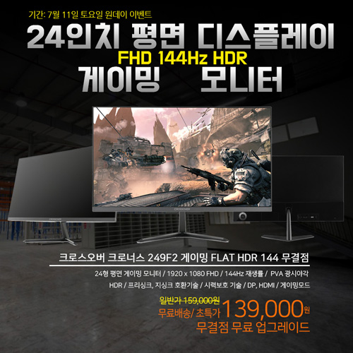 크로스오버존이 24형 144Hz 게이밍 모니터인 ‘크로너스 249F2 게이밍 FLAT HDR 144Hz 무결점’ 및 ‘32SS PLUS QHD 75 HDR 평면 떡상 무결점’, 그리고 ‘32UL980 TYPE-C / 32UL980M HDR 4K 프리미엄 멀티’ 특가 행사를 진행한다.