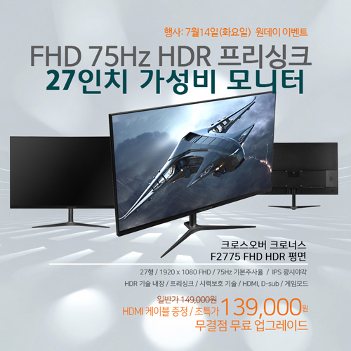 크로스오버존은 보급형 27형 모니터 '크로너스 F2775 FHD HDR 평면 무결점’을 대상으로 특가 이벤트를 진행한다. 행사는 7월 14일 화요일 지마켓 슈퍼딜을 대상으로 진행된다. 행사 기간 동안 F2775 FHD HDR 평면 무결점은 행사가 139,000원에 판매된다. 기본 포함된 HDMI 케이블 외 HDMI 케이블을 하나 더 무료로 증정한다. 준비된 수량은 100개이며, 모두 소진되면 행사는 종료된다.