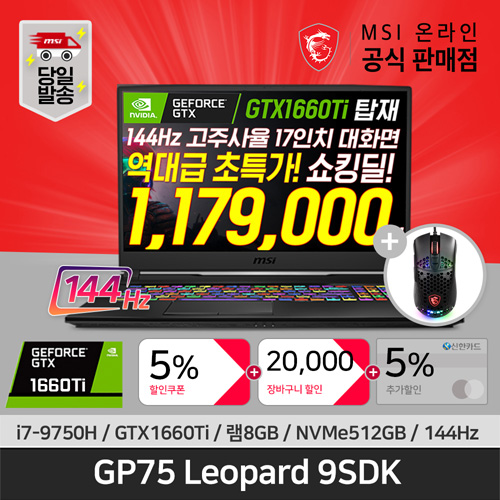 긴급공수 제품인 MSI GP75 Leopard 9SDK는 인텔 i7 프로세서 및 GTX 1660 Ti를 탑재하여 뛰어난 게이밍 성능을 제공한다. 144Hz IPS 타입 패널로 빠르고 역동적인 게임 시에도 부드럽고 신속한 화면을 체감할 수 있다. 각도에 따른 왜곡 없이 생생한 컬러와 선명한 화면을 제공한다.