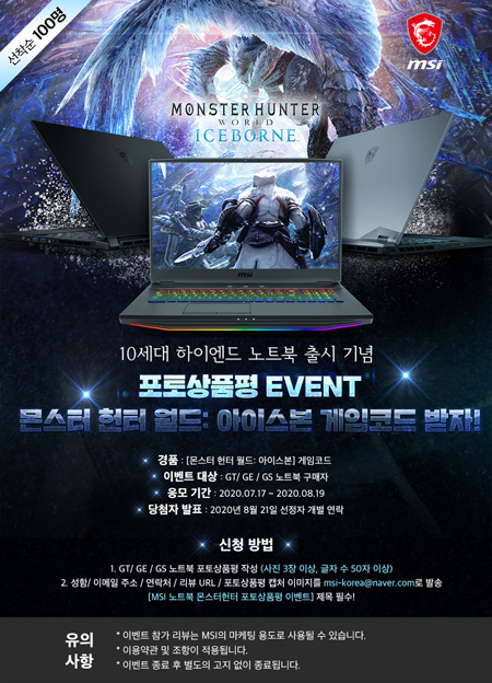 엠에스아이코리아는 MSI 하이엔드 노트북 구매 시 ’몬스터 헌터 월드: 아이스본’ 게임 코드를 증정한다. 이번 프로모션은 2020년 08월 19일까지 진행되며, 코드 사용 기간은 2020년 12월 31일까지다. 선착순 100명 한정으로, 소진 시 본 행사는 예고 없이 종료될 수 있다.