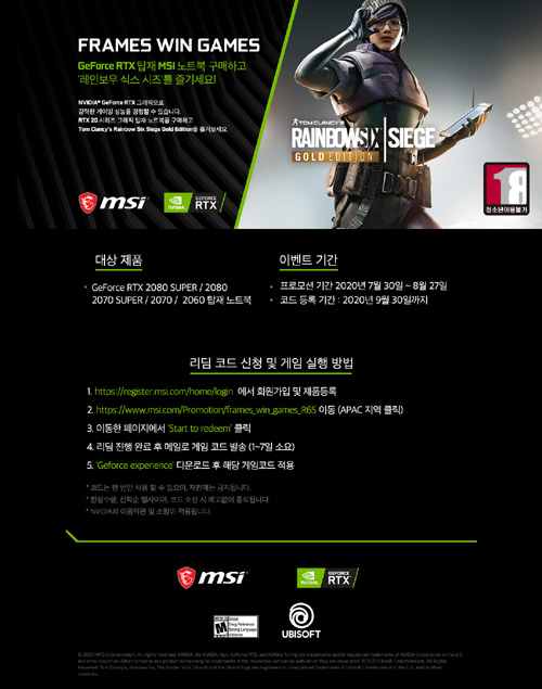 엠에스아이코리아는 엔비디아 지포스 RTX 20시리즈 그래픽 탑재 노트북 구매자를 대상으로 '레인보우 식스 시즈 골드 에디션' 리딤 코드를 증정한다.