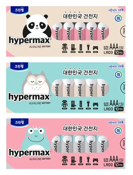 이번에 출시한 ‘하이퍼맥스’는 어린이 및 청소년 소비자를 겨냥한 엉이(부엉이), 구리(개구리), 판다(팬더) 등 귀여운 캐릭터 디자인 시리즈 건전지다. 각 캐릭터마다 AA 사이즈와 AAA 사이즈로 구매할 수 있으며, 10개입씩 구성됐다. 제품은 광주에 위치한 알이배터리 생산 공장에서 100% 자체 개발 및 생산된다.