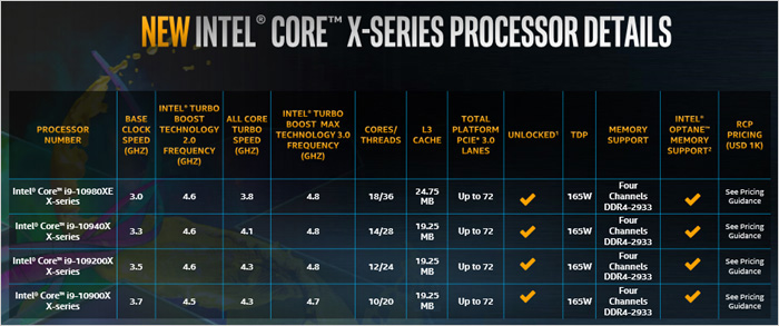 10세대 X-시리즈 프로세서는 4종으로 모든 제품이 오버클럭을 지원하며 PCIE 3.0 레인, TDP, 지원 메모리 등은 동일하다. 그에 반해 코어와 스레드, 기본 클럭과 터보부스트, 올코어 클럭 등은 제품에 따라 달라 가격이나 성능등을 고려해 제품을 선택하면 된다.