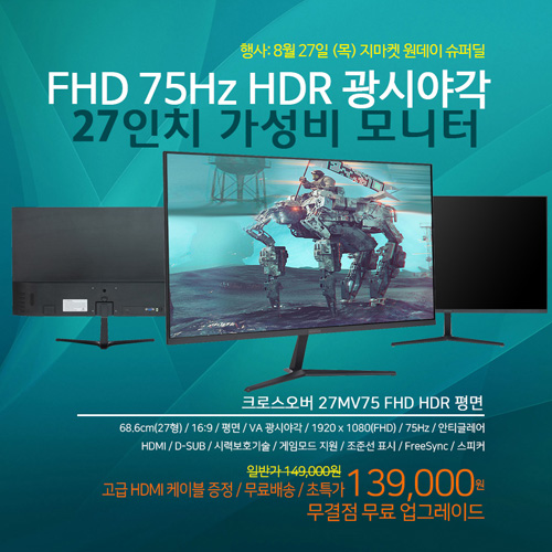 크로스오버존 새롭게 출시된 크로스오버존 모니터 '크로스오버 27MV75 FHD HDR 평면 무결점’을 대상으로 특가 이벤트를 펼친다. 행사는 8월 27일 목요일 지마켓 슈퍼딜을 대상으로 진행된다. 행사 기간 동안 27MV75 FHD HDR 평면 무결점은 행사가 139,000원에 판매된다. 구매자의 부담을 덜기 위해 배송비는 무료로 진행되며 HDMI 케이블을 무료로 증정한다. 준비된 수량은 100개이며, 모두 소진되면 행사는 종료된다.