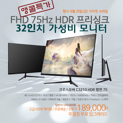 크로스오버존은 새롭게 출시된 모니터 '크로스오버 C3210 HDR 평면 75 무결점’을 대상으로 특가 이벤트를 펼친다. 행사는 8월 28일 금요일 지마켓 슈퍼딜을 대상으로 진행된다. 행사 기간 동안 C3210 HDR 평면 75 무결점은 행사가 189,000원에 판매된다. 구매자의 부담을 덜기 위해 배송비는 무료로 진행되며 HDMI 케이블을 무료로 증정한다. 준비된 수량은 100개이며, 모두 소진되면 행사는 종료된다.