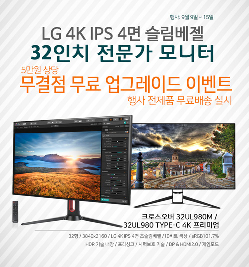 (9월 9일~15일) 32UL980M 무결점 옥션 이벤트는 (reurl.kr/38DA0E11YZ), 32UL980M 무결점 지마켓 이벤트는 (reurl.kr/38DA0E13EZ)을 참조하기 바란다.