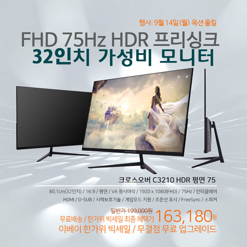 크로스오버존은 새롭게 출시된 모니터 '크로스오버 C3210 HDR 평면 75 무결점’을 대상으로 특가 이벤트를 펼친다. 행사는 이베이 한가위 빅세일을 맞아 9월 14일 월요일 옥션 올킬을 대상으로 진행된다. 행사 기간 동안 C3210 HDR 평면 75 무결점은 행사가 163,180원에 판매된다. 구매자의 부담을 덜기 위해 배송비는 무료로 진행된다. 준비된 수량은 100개이며, 모두 소진되면 행사는 종료된다.
