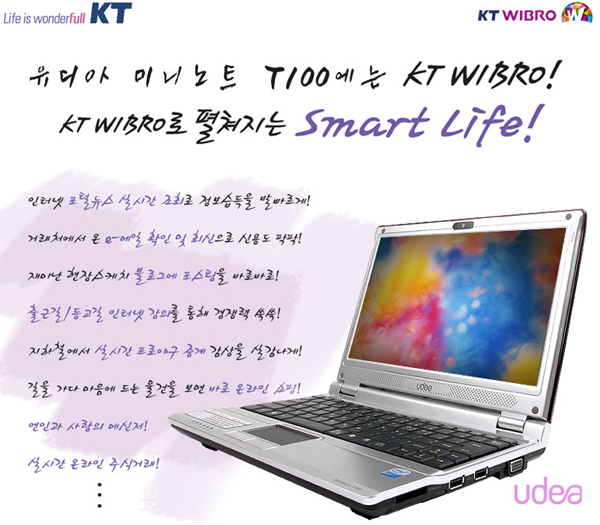 지난 9년간 IT미디어 사이트 'PCBee'를 비롯하여 국내 최초의 IT 전문 온라인 방송 사이트 'WebTV'등으로 잘 알려져 있는 이비커뮤니케이션(주)에서 운영중인 '와이브로유저닷컴(www.wibrouser.com)'과의 협업을 통해 KT 와이브로와 제이씨현시스템의 넷북 '유디아(Udea) T100'과의 결합상품을 저렴한 가격에 구입할 수 있는 기회를 마련했사오니 회원님의 많은 관심 부탁드립니다.