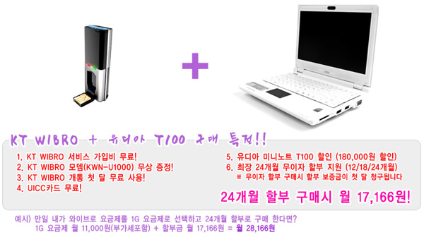 '유디아 T100'과 '와이브로' 결합상품은 노트북만 구입하였을 때 보다 훨씬 저렴한 가격에 구매가 가능하며 다음과 같은 특전이 제공됩니다.