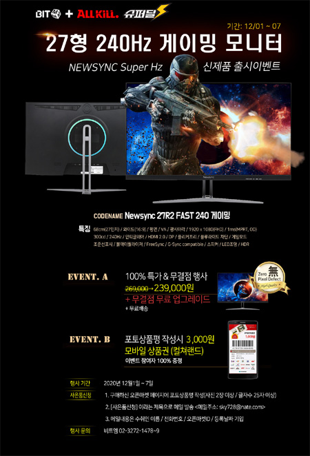 비트엠은 ‘27R2 FAST 240 게이밍’ 모니터 출시를 기념하기 위해 옥션 지마켓 특가전을 실시한다. 12월 1일(화요일)부터 7일(월요일)까지 옥션 지마켓을 대상으로 열리는 이번 행사 기간 동안 27R2 FAST 240 게이밍 모니터 무결점 버전은 특별 할인가 239,000원에 판매된다. 포토 상품평 작성자들을 대상으로 모바일상품권 3,000원을 증정하는 포토상품평 이벤트도 같이 진행한다.