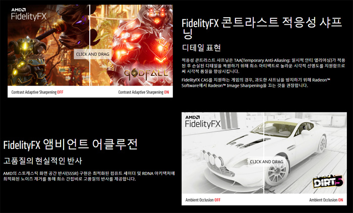 콘트라스트 적응성 샤프닝은 일시적인 안티 앨리어싱이 적용된 후 손상된 디테일을 복원하기 위한 최소의 아티팩트로 선명도와 품질을 높인다. 또한 앰비언트 어클루전은 최적화된 컴퓨트 셰이더 및 RDNA 아키텍처에 최적화된 노이즈 제거 기술을 통해 고품질의 반사 효과를 제공한다. 레이싱 게임인 더트 5 등에서 확연한 효과를 경험할 수 있다.