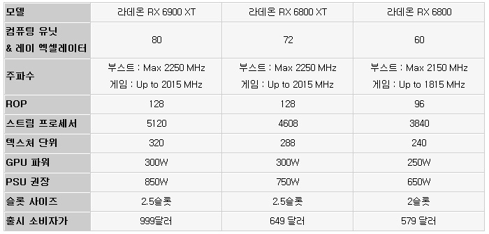 AMD 라데온 RX 6000 시리즈는 3개의 라인업으로 출시되어 퍼포먼스나 가격에 따라 선택할 수 있다. 최상위 모델인 라데온 RX 6900 XT 는 80개의 컴퓨팅 유닛과 레이 엑셀레이터를 지원하며 부스트 클럭은 2250MHz 에 달한다. 300W 의 높은 전력을 소모하며 기본적으로 850W 정도의 최고급형 파워 서플라이를 사용해야 원할하게 PC를 서용할 수 있다. 라데온 RX 6800 시리즈는 6800 XT 와 6800 으로 출시되는데 스펙에서 분명한 차이를 보여주어 가격등을 고려해 제품을 구입하면 된다.