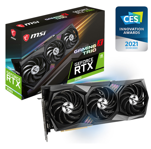 MSI 지포스 RTX 3080 게이밍 X 트리오 10GB 트라이프로져2 그래픽카드를 포함한 총 15개의 CES 2021 혁신상을 받는 MSI 제품들은 온라인 생중계를 통해 1 월 13 일에 공식 발표된다.
