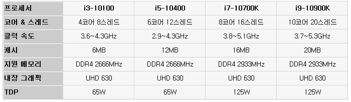 10세대 인텔코어 프로세서는 i3부터 i9까지 다양한 라인업으로 출시되고 있다. 특히 내장그래픽을 지원하지 않는 F프로세서와 배수락 해제로 오버클럭이 가능한 K프로세서로 세분화 되어 사용자가 원하는 제품을 쉽게 구입할 수 있도록 배려하고 있다.