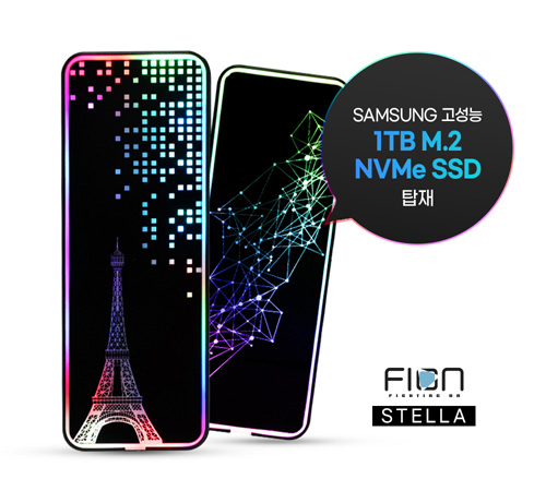 스텔라 RGB M.2 NVMe 1TB 외장SSD는 스텔라 RGB M.2 NVMe 외장SSD 케이스에 국내 SSD 시장 점유율 1위로 내구성과 안정성이 검증된 삼성의 1TB M.2 NVMe SSD를 적용하여 읽기/쓰기 속도 모두 최대 1GB/s를 기록하는 고성능 외장 SSD이다. 스텔라 RGB M.2 NVMe 1TB 외장SSD는 USB 3.0 외장 HDD 대비 8-9배 이상 빠른 속도로 데이터 전송이 가능하며, 스타일리시한 오로라 문양과 에펠탑 문양의 강화 유리 커버를 투과하는 은은하고 감각적인 RGB 라이팅 효과가 매우 인상적인 제품이다. 스텔라 RGB M.2 NVMe 1TB 외장SSD는 윈도우 10/맥 OS/안드로이드 OS를 지원하며 USB 타입-C to C 케이블과 타입-A 젠더를 제공하여 높은 호환성과 뛰어난 연결 편의성을 제공한다.